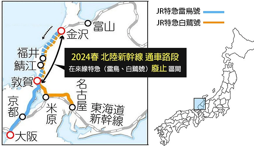 想從大阪、京都一路往北玩到金澤,過去許多旅客都會選擇搭乘JR特急雷鳥號列車(サンダーバード),從大阪直達金澤單程約2小時45分,快速又便利。但因應日本北陸新幹線的新路段「敦賀―金澤」開通,雷鳥號已不再運行「大阪―金澤」路段,僅運行「大阪―敦賀」路段;此外受影響的還有JR特急白鷺號「名古屋―金澤」路段,相對位置可見示意圖。