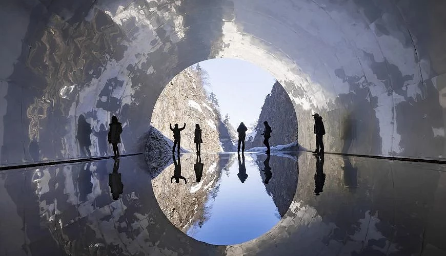 隧道終點的「Panorama Station」同時也是藝術作品《Light Cave 光之洞窟》,透過薄水層與反射的設計,化為一座鏡面水池,將峽谷、天空與訪客身影融為一體,是整個清津峽溪谷隧道最具代表性的空間。半鏡面的不鏽鋼沿著隧道內壁延展,將周圍的自然景色引入其中,加上峽谷影像映射在水面上,上下顛倒、無限延伸,現實與映像相互交錯,營造出令人難以忘懷的夢幻景致。