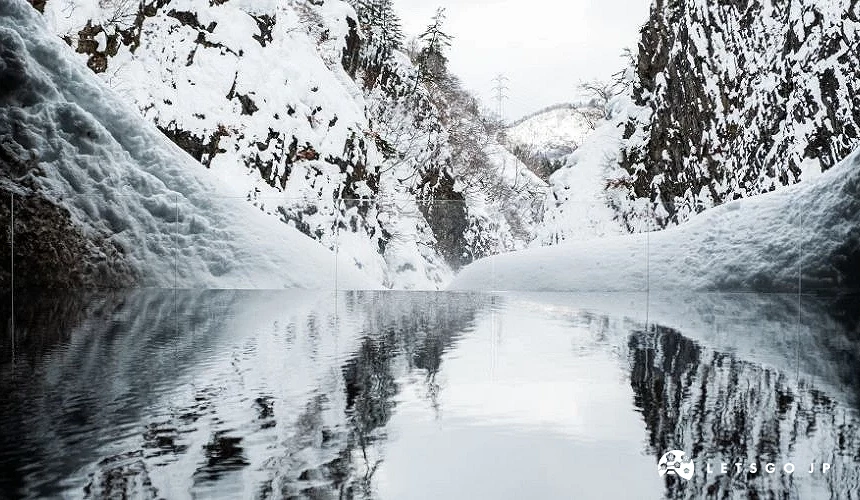清津峽是由清津川貫穿並切割而成,V 字峽谷與巨大的柱狀節理岩壁十分壯觀,被列為日本三大峽谷之一。隧道盡頭可見著名的「鏡面水池」,光線映照在水面上,反射出峽谷景色,營造出如夢似幻的視覺效果,是 IG 上爆紅的拍照打卡景點!