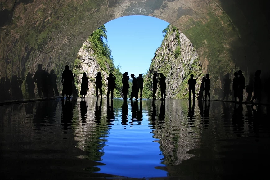 清津峽溪谷隧道不只是一條連結峽谷景觀的通道,本身更是越後妻有大地藝術祭的常設作品《Tunnel of Light》。全長約 750 公尺的隧道被視為一艘與外界隔絕的「潛水艇」,沿途設置的觀景點與終點的全景展望空間,則如同眺望外界的「潛望鏡」。在行走與停留之間,觀者從不同角度觀看峽谷景觀,移動的過程即構成藝術體驗的一環,在前行中看見自然、感知自然,並與自然逐步展開對話。