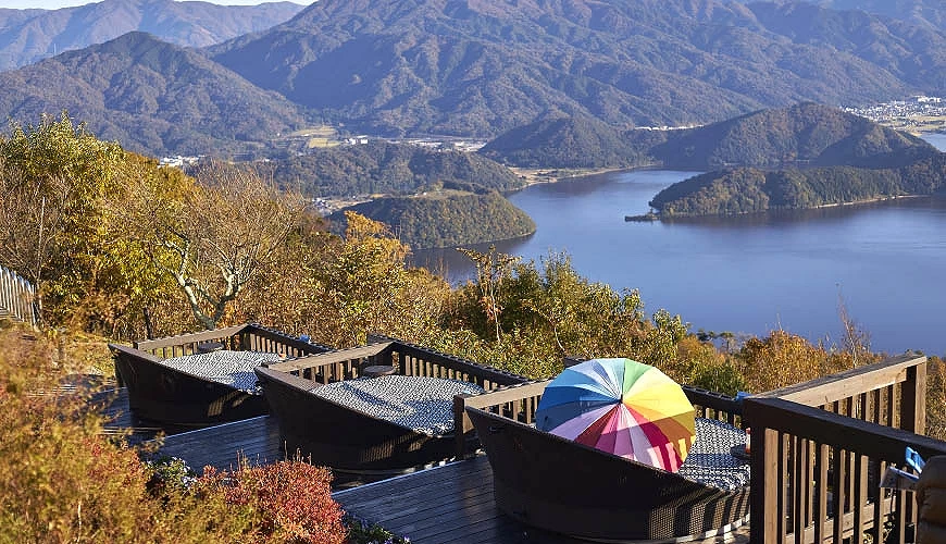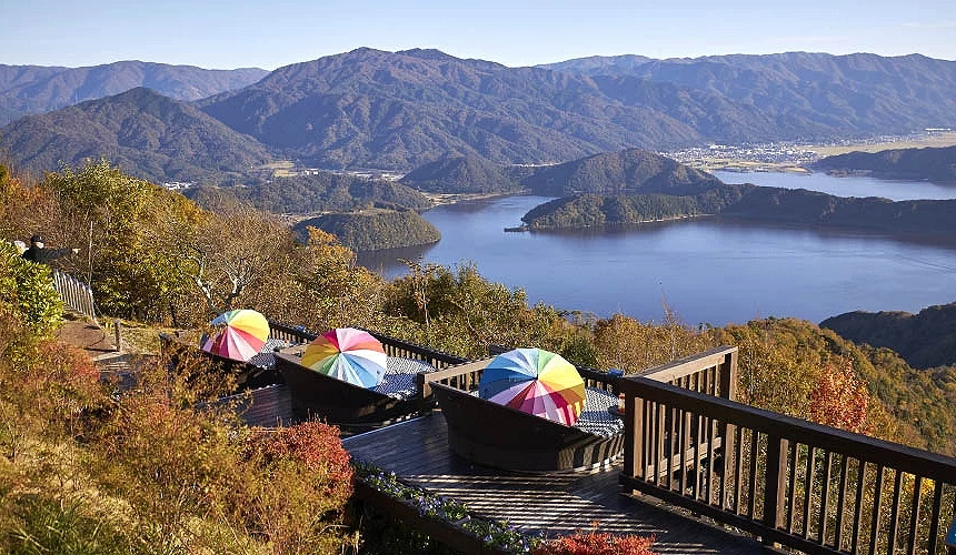 搭乘廂型纜車或單人椅纜車緩緩登頂,「三方五湖」的壯闊全景隨之展開。晴朗時甚至能遠眺日本海與若狹灣的閃耀海面。公園內設有可泡腳賞景的「天空足湯」、彩虹傘觀景台與戀人聖地鐘塔,還能在咖啡廳邊欣賞山海交融的景色,邊品嚐限定聖代,體驗「邊看湖邊吃甜點」的療癒時光。